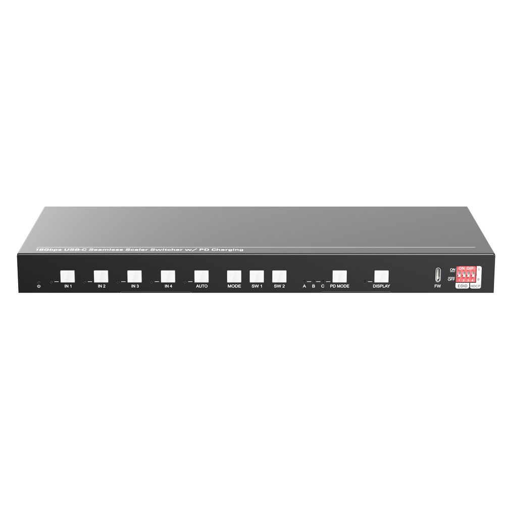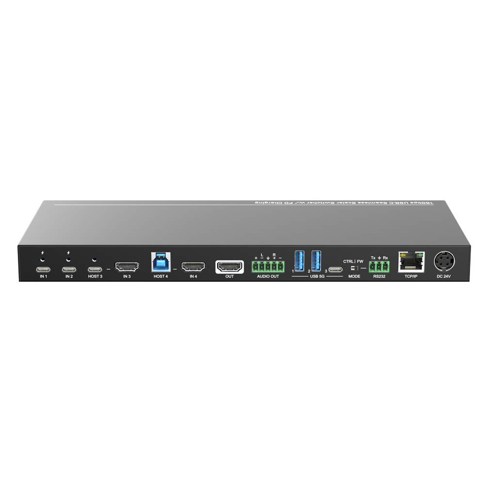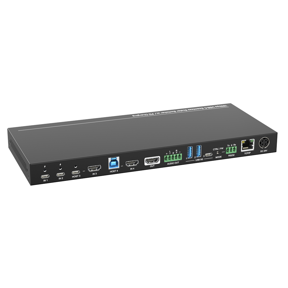 The SF41-H2 is a 4x1 switcher with two USB-C and two HDMI 18G input ports, plus one HDMI 18G output. It supports manual/automatic switching and resolutions up to 4K@60Hz 4:4:4. The USB-C ports provide 15W/60W/100W PD to source PCs. It includes one USB-C and one USB-B as HDMI hosts, a 5-pin balanced audio output, and two USB-A/one USB-C ports for KVM connectivity (up to 5Gbps). An RS232 port enables control/firmware upgrades, and an RJ-45 port accesses the GUI. Features include scaling, EDID, and HDCP management.