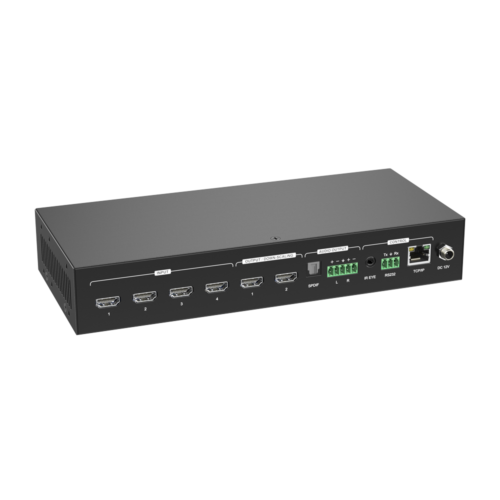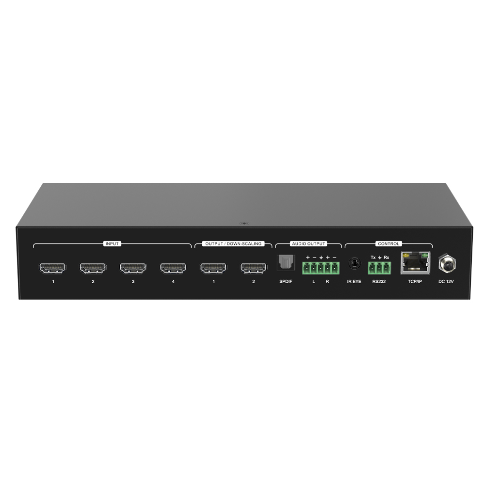 In addition, Output 1/2 supports automatic downscaling, dynamically matching the optimal resolution of the display device. It offers four control methods: front panel buttons, IR, RS-232 and web-GUI, to adapt to the user's control needs.
