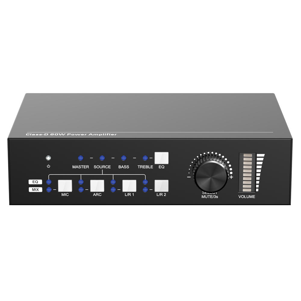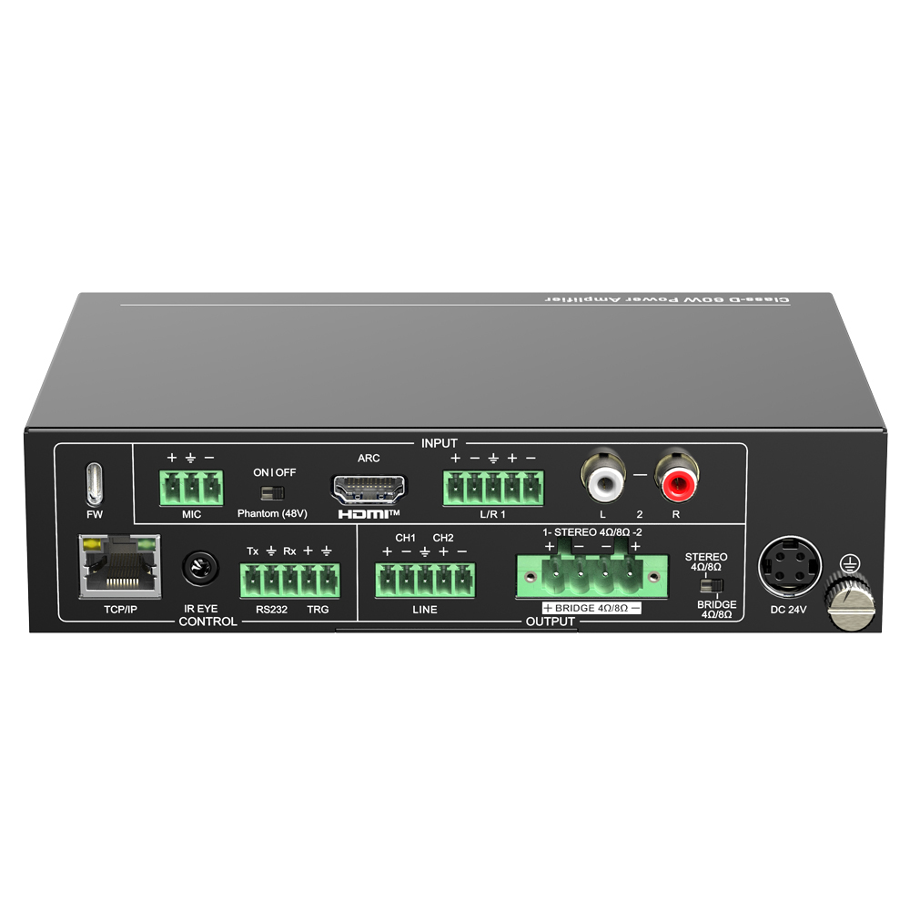 The PA4260 is a compact Class-D 4×2 power amplifier delivering 2×30W @ 4Ω (or bridged 1×60W @ 4Ω) for small to medium AV installations.