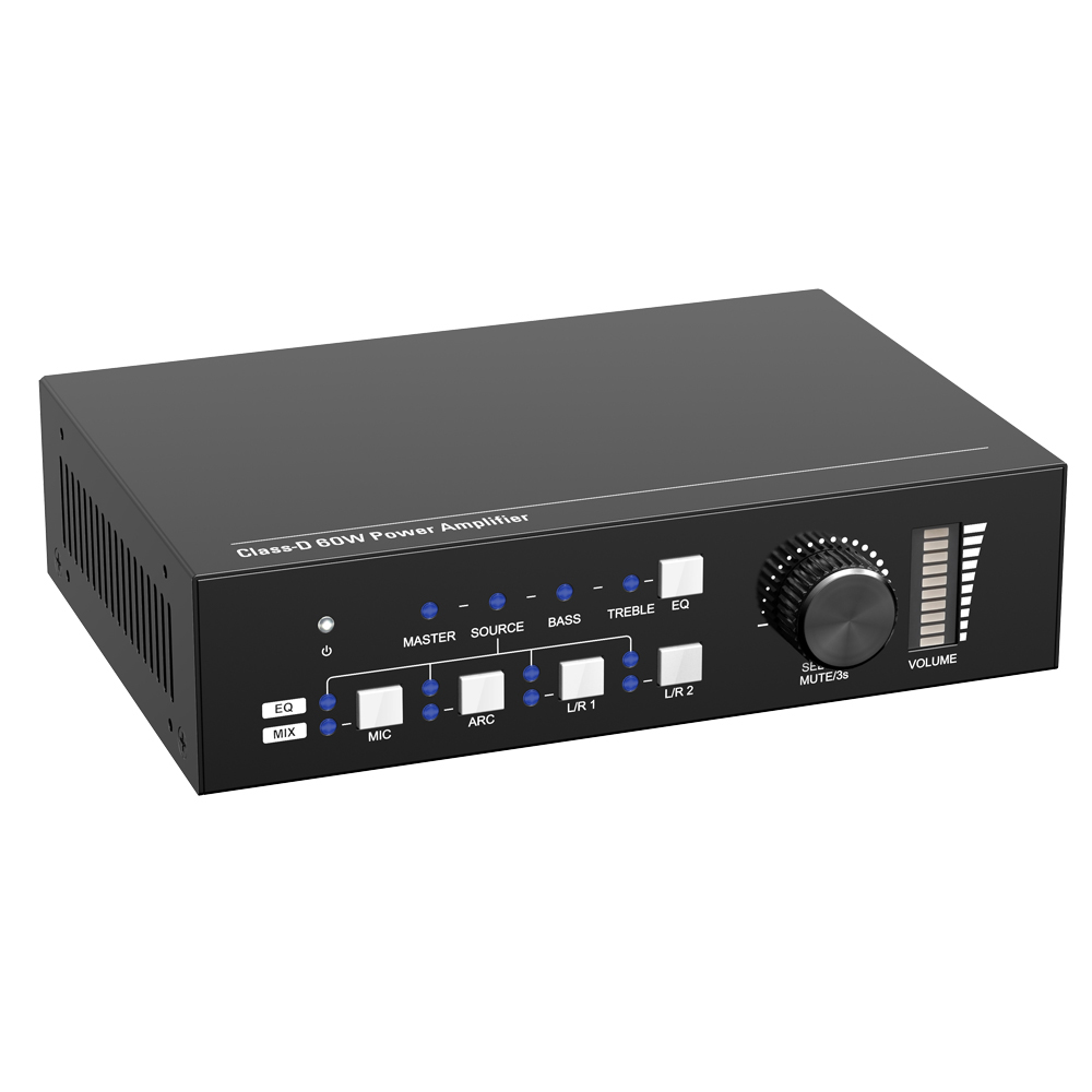 It offers 4 inputs (Mic with 48V phantom power, 2× Line, ARC) and 2 outputs (Amp + Line), with built-in audio mixing and EQ adjustment.