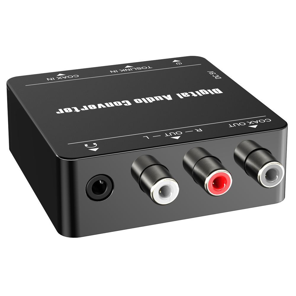 The optical input can be split to 3 simultaneous outputs, while the coaxial input can be converted and split to 2 analog outputs at the same time. Output options include RCA (lotus), 3.5mm stereo jack, and coaxial digital pass-through.
