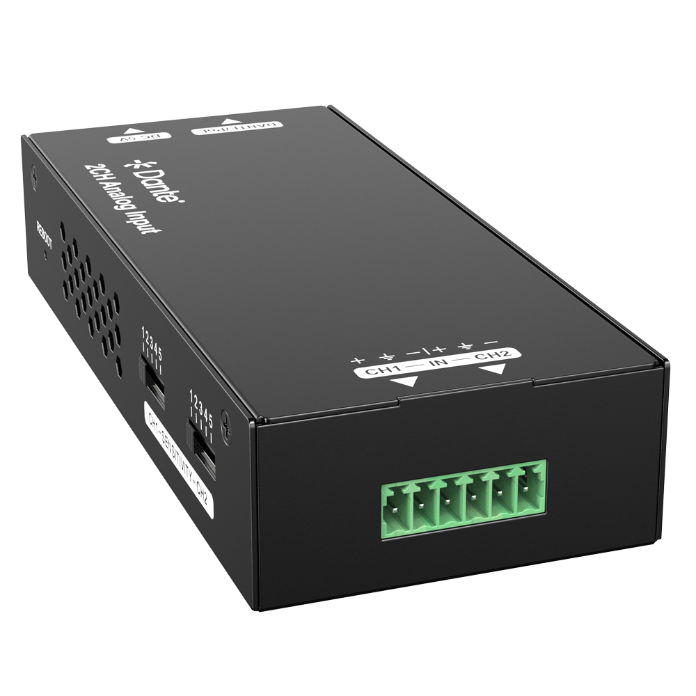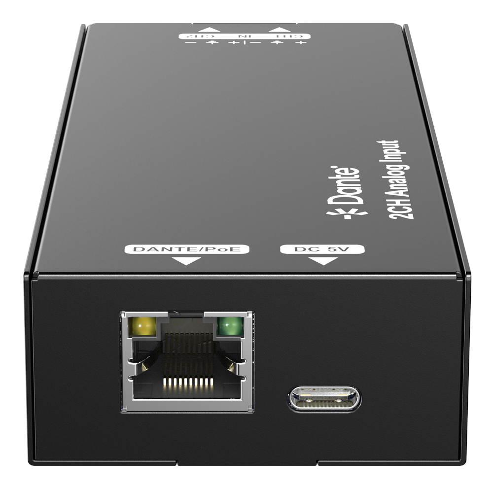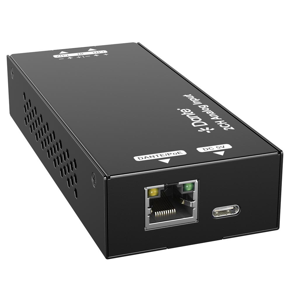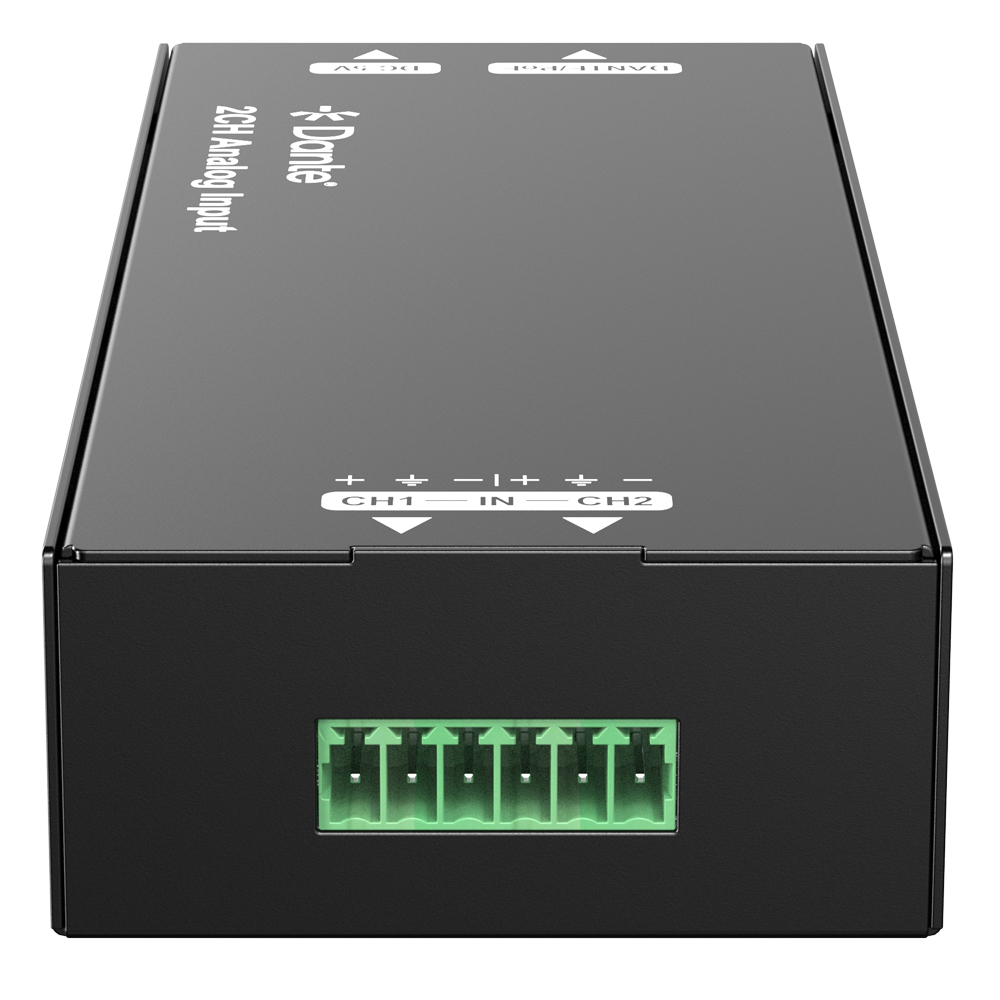 The DAN-DA2I-PRO is a 2CH analog to Dante converter. It inputs audio via the 6-pin phoenix socket, transmits data via the Dante interface. Users can control and distribute audio through the Dante Controller. Its compact and portable design makes it suitable for use in various scenarios.