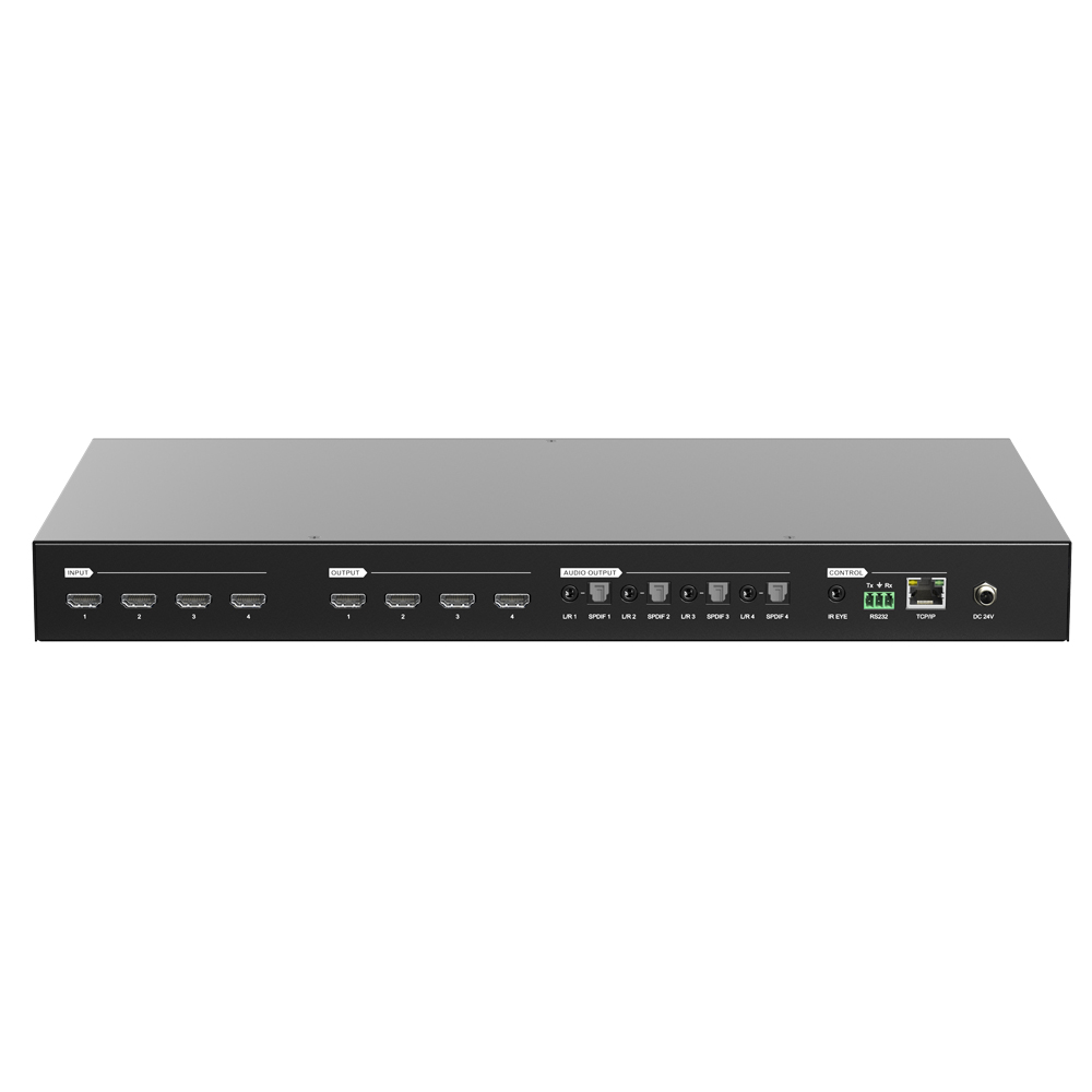 It includes 4 HDMI inputs, 4 HDMI outputs. It also features 4 SPDIF and 4 analog audio outputs for audio matrix.