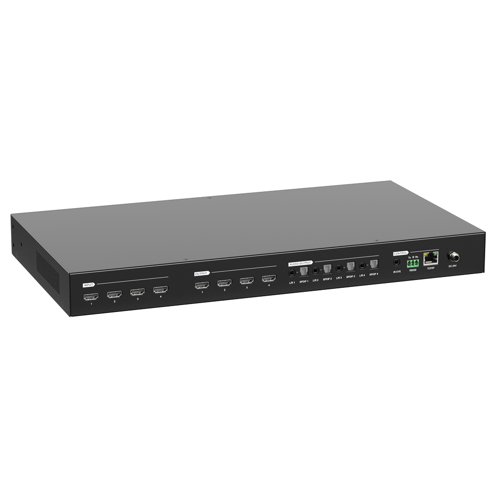 The FSC44-H2 is a 4x4 HDMI matrix switcher that supports signals up to 4K@60Hz in 4:4:4 resolution. It features audio de-embedding, separating audio from the HDMI signal for independent audio and video outputs.