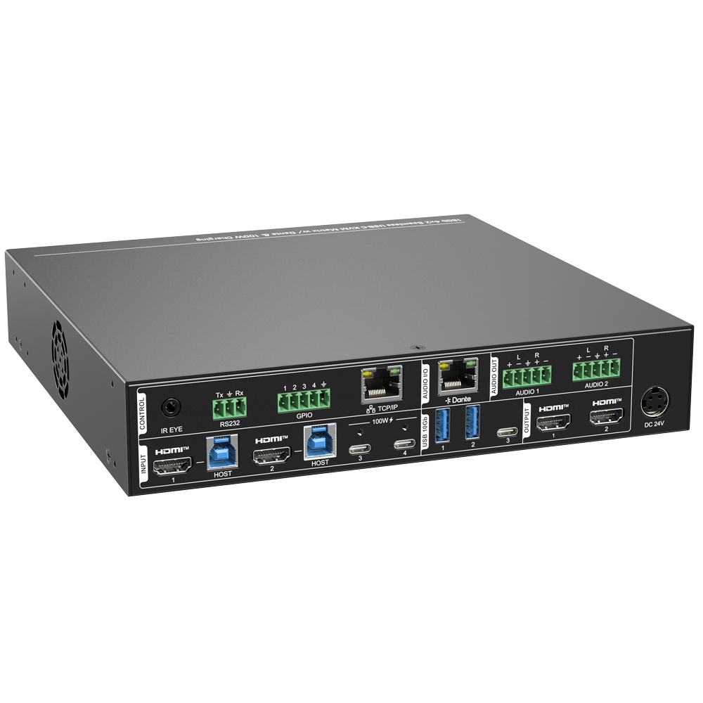 It supports HDMI 18G with 4K@60Hz 4:4:4, HDCP 2.2, and 5Gbps USB data for smooth peripheral sharing. The unit features Dante 4×4 audio channels for professional networked audio routing, dual USB-C ports with up to 100W Power Delivery charging, and Gigabit Ethernet passthrough for convenient network connectivity.