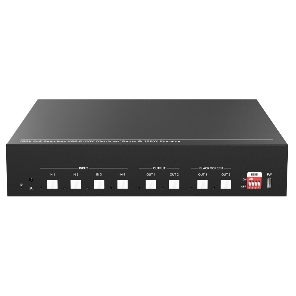 The VP-42D-KVM is a high-performance 4×2 seamless KVM switcher with advanced Dante audio integration, designed for professional 4K AV and control applications in meeting rooms, control centers, and hybrid workspaces.