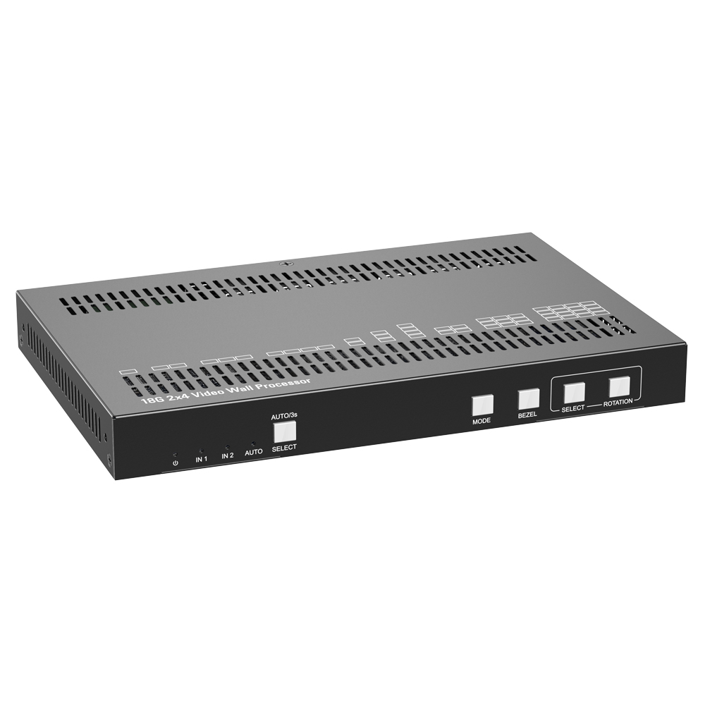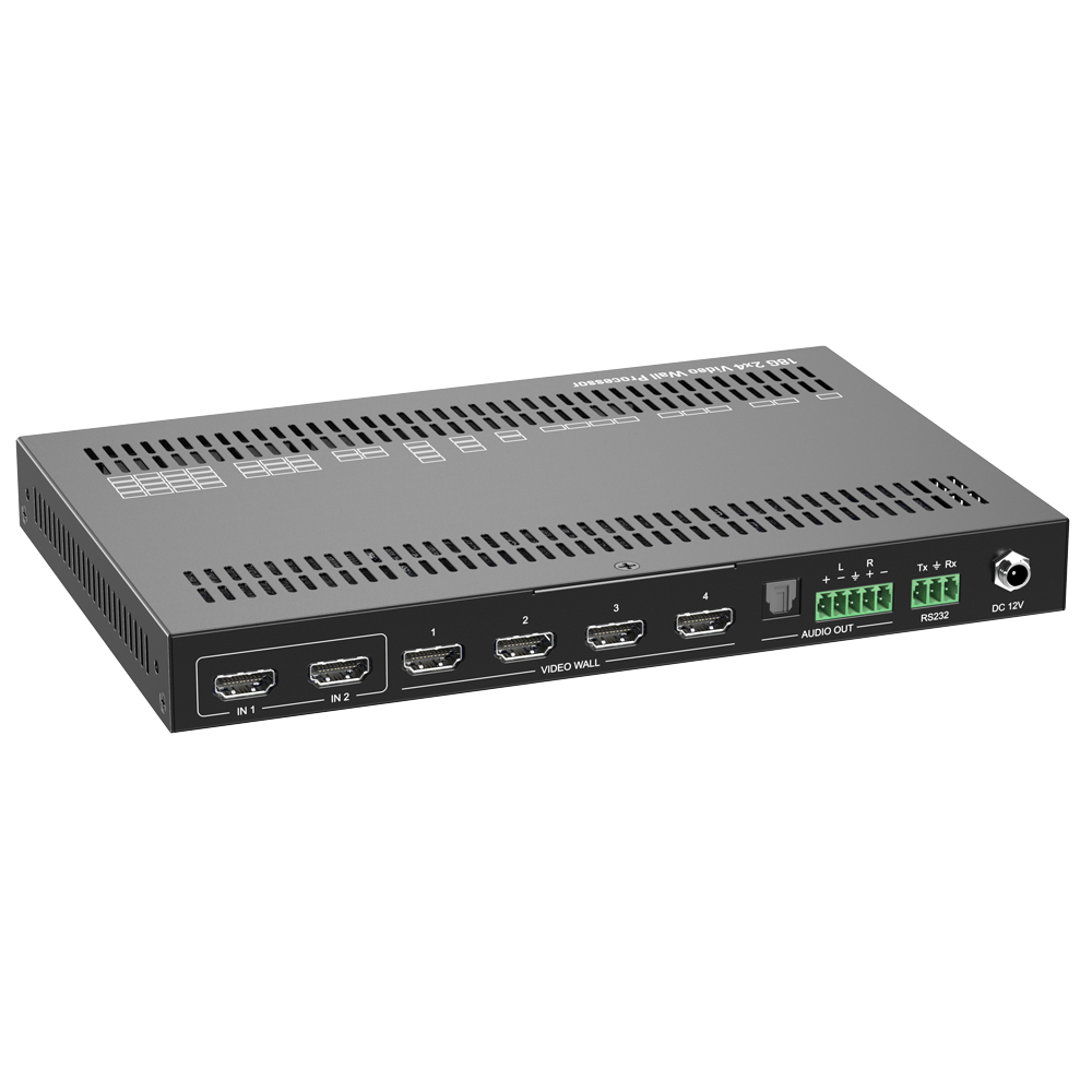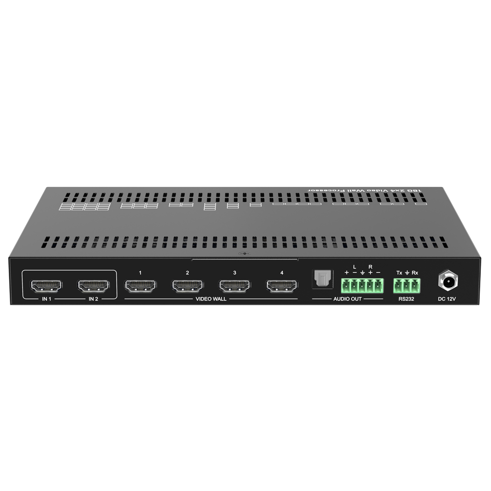 The SCU-VW 4 is an 18G 2x4 Video Wall Processor delivers exceptional performance with two HDMI inputs supporting up to 4K@60Hz 4:4:4 for high-quality visuals, while the HDMI output is fixed at 1080p@60Hz for reliable display compatibility. It offers flexible control through front panel buttons and RS232, ensuring seamless operation. The device supports cascading for expanded setups, audio extraction for enhanced sound integration, and features eight selectable video wall modes to suit various configurations. Additionally, it provides output video rotation and BEZEL mode for precise and customizable display adjustments.